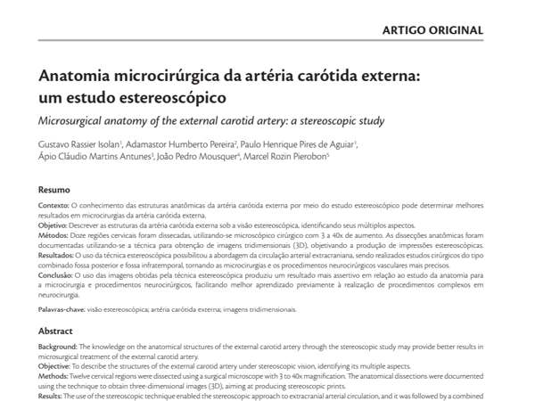 A artéria carótida externa possui anatomia complexa, que deve ser conhecida em profundidade por cirurgiões vasculares, neurocirurgiões, cirurgiões de cabeça e pescoço, entre outros profissionais. Quando estudada mediante material fotográfico convencional, esta anatomia não transmite ao leitor a real profundidade de algumas estruturas. Tentando diminuir esse problema e buscando uma noção tridimensional nos materiais impressos, criou-se o método anaglífico tridimensional (3D). A proposta deste estudo é apresentar em detalhes os resultados das dissecções microcirúrgicas da artéria carótida externa, por meio de documentação estereoscópica.