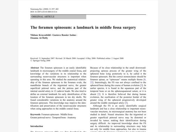 O forame espinhoso é um acidente facilmente identificável na microcirurgia da fossa craniana média. O conhecimento das variações na sua relação com as estruturas neurovasculares ao seu redor é importante ao operar nessa área. Nós estudamos a relação anatômica do forame espinhoso com o oval, o ramo mandibular do nervo trigêmeo, o nervo petroso superficial maior e a parte petrosa da artéria carótida interna em 12 cabeças de cadáveres. Nós também tentamos definir uma marcação externa para identificação anterior da localização do forame espinhoso em dez crânios secos. Encontramos variações consideráveis na anatomia ao redor do forame espinhoso. O conhecimento pode melhorar a identificação e preservação das estruturas neurovasculares ao usar abordagens na fossa craniana média.