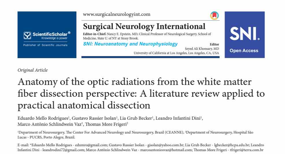 A Anatomia das Radiações Ópticas e sua importância nos bons resultados cirúrgicos em tumores do cérebro é discutida nesse artigo publicado pelos neurocirurgiões Gustavo Isolan e Eduardo Melo no jornal brasileiro de neurocirurgia. Experiência e equipe multidisciplinar são essências para se obter sucesso em cirurgia da gliomas. O neurocirurgião Gustavo Isolan é um dos mais renomados médicos no brasil e no mundo com experiência grande na microcirurgia dos pacientes com tumores da base do crânio e da fossa posterior, bem com o cirurgia dos gliomas, glioblastomas entre outros, tendo obtido ótimos resultados e preservação do nervo facial na grande maioria dos pacientes tratados.