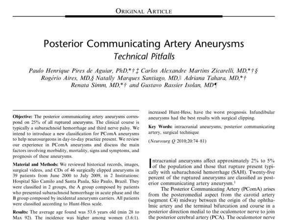 Os aneurismas da artéria comunicante posterior correspondem a 25% de todos os aneurismas rompidos. O curso clínico é tipicamente uma hemorragia subaracnoidea e paralisia do terceiro par de nervo craniano. Nós pretendemos introduzir uma nova classificação para aneurismas para auxiliar neurocirurgiões na prática do dia-a-dia. Nós revisamos nossa experiência em aneurismas e discutimos os principais fatores envolvendo morbidade, mortalidade, sinais, sintomas e prognóstico desses aneurismas.