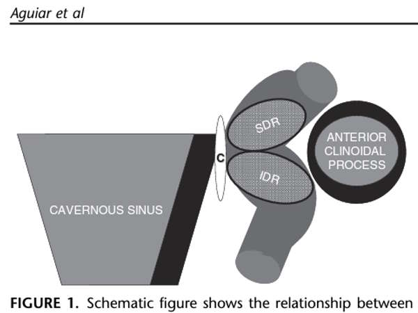 Aneurismas paraclinoides são frequentemente encontrados no sifão carotídeo. O segmento clinoide da artéria carótida interna(ACI) está situado na transição da artéria do seio cavernoso para o espaço subaracnoide. Esta região foi mal estudada porque a anatomia dessa região é extremamente complexa e variável. Entender o segmento clinoide é importante para diagnosticar corretamente e para lidar com esses aneurismas, porque os riscos de ruptura daqueles variam com a localização específica das lesões ao longo desse pequeno segmento da ACI. A áreas de origem, projeção e relação de aneurismas surgindo do segmento oftálmico da ACI para estruturas adjacentes são heterogêneas. A anatomia complexa da ACI paraclinoide faz o manejamento cirúrgico dos aneurismas nascentes desse segmento difícil. As principais ações do tratamento cirúrgico de sucesso dessas lesões incluem estabilizar controle da artéria proximal, exposição adquada do ”pescoço” do aneurisma e obliteração bem sucedida do aneurisma com mínima manipulação do nervo óptico. O cavo carotídeo é um espaço mínimo, imerso em um pequeno segmento da ACI- o clinoide. Este está situado dentro do espaço clinoide. O segmento foi mal estudado e, por essa razão, a nomenclatura de aneurismas dessa área é extremamente confusa. Esse artigo revisou a anatomia microcirúrgica do cavo carotídeo, a região paraclinoide, o espaço clinoide e a significância clínica da anatomia de acordo com o crescimento do aneurisma.