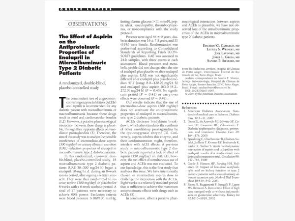 O uso de aspirina é recomendado como estratégia de prevenção cardiovascular em pacientes com diabete melito. Em decorrência do risco de eventos hemorrágicos e da hipótese de que poderia haver um agravamento das complicações microvasculares associado ao uso da aspirina, tem havido importante sub-utilização dessa terapia. Entretanto, está definido que o uso de aspirina não piora a retinopatia diabética e existem evidências de que também não afeta a função renal em doses usuais (150 mg/dia). Por outro lado, pacientes com diabete melito parecem necessitar de doses maiores do agente antiplaquetário, o que sugere que esses indivíduos apresentem a chamada “resistência à aspirina”. Os mecanismos dessa resistência ainda não estão completamente esclarecidos, estando provavelmente relacionados à atividade plaquetária intrínseca anormal. Portanto, o emprego de terapêuticas antiplaquetárias alternativas ou a administração de doses maiores de aspirina (150–300 mg/dia) devem ser melhor avaliados em relação a um aumento da eficácia na prevenção da doença cardiovascular e também a possíveis efeitos nas complicações microvasculares no diabete melito.