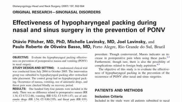 O objetivo desse estudo é avaliar a eficiência de bolsas hipofaríngeas na prevenção de vômitos e náuseas pós-operatórias (VNPO) na cirurgia nasal. Resultados sugerem que não há benefícios delas em relação á prevenção de VNPO na cirurgia nasal. Novos estudos com um número maior de pacientes devem ser feitos para confirmar esses resultados.