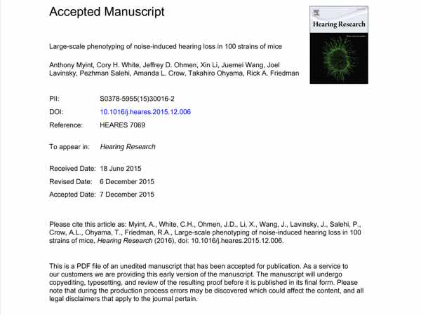 Nesse estudo, nós expandimos mais sobre a literatura existente ao caracterizar as qualidades dos padrões da RATE de linhagens de camundongos praticamente idênticos, 47 dos quais tiveram suas características para função auditiva redefinidas. Nós identificamos vários padrões distintos déficits auditivos e provemos aberturas potenciais para investigação futura. Além disso, nós caracterizamos a sensibilidade para exposição à barulho das mesmas 100 linhagens usando trocas permanentes de limiares, identificando vários padrões distintos de sensibilidade ao barulho. Os dados resultantes provêm um novo recurso para o estudo de perda auditiva e de sensibilidade a ruídos em camundongos.